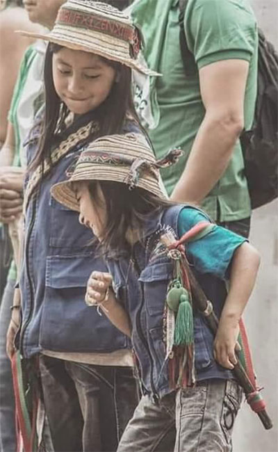 Meu filho mais velho, Sekyu Chindicue Gurrute, nasceu no território ancestral da reserva indígena de Totoró, na zona oriente. Sua mãe está lhe ensinando toda essa sabedoria, o conhecimento do processo de organização indígena. Juan Diego Chindicue Gurrute [o segundo filho] também está nessa jornada. Não conseguimos agendar para que ele nascesse em território indígena, então nasceu na cidade de Cali e, a partir de então, nós quatro começamos a sair da cidade.
