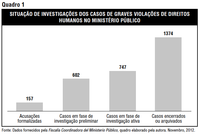 De acordo com o Fiscal Coordinador de las Fiscalías Superiores y Penales, Víctor Cubas Villanueva (Procurador-Geral das Unidades do Ministério Público Superior e Criminal), o principal motivo pelo qual os casos de violação de direitos humanos sob investigação têm sido encerrados é a insuficiência de informações que permitam a identificação dos supostos autores. Ele argumentou que a falta de informações é o resultado direto das constantes negativas, por parte das Forças Armadas e do Ministério da Defesa, em fornecer tais informações aos investigadores, ou à sua alegação de que essas informações não existem.20 Em um esforço para resolver esse impasse, comissões compostas por representantes do Ministério Público, do Ministério da Defesa e da Defensoria foram formadas em duas ocasiões distintas, mas não houve nenhuma mudança no quadro.21