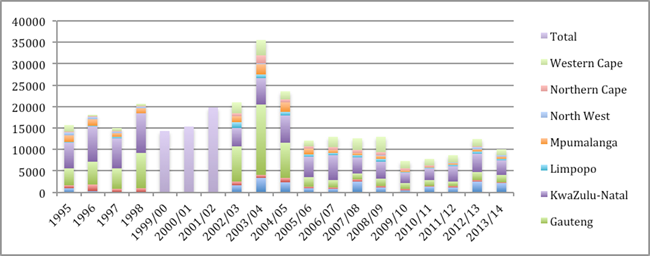 Considerando o período entre 1995 e 2013/2014, é possível notar que a grande maioria das armas de fogo foi apreendida durante os dez primeiros anos das operações de grande proporção. Isto é, período no qual houve uma concentração de operações de grande proporção, sendo que as maiores apreensões anuais foram registradas durante 2003 e 2004, período que corresponde à implementação de uma operação específica, especializada e intensiva contra as armas de fogo, intitulada Sethunya. Posteriormente, houve um declínio notável na apreensão de armas de fogo, que passou a ter uma média de aproximadamente 10.000 armas de fogo por ano. Em relação à desagregação de dados por região, a maioria das armas de fogo apreendidas pelo SAPS eram das regiões de Gauteng, KwaZulu-Natal, Eastern Cape e Western Cape.