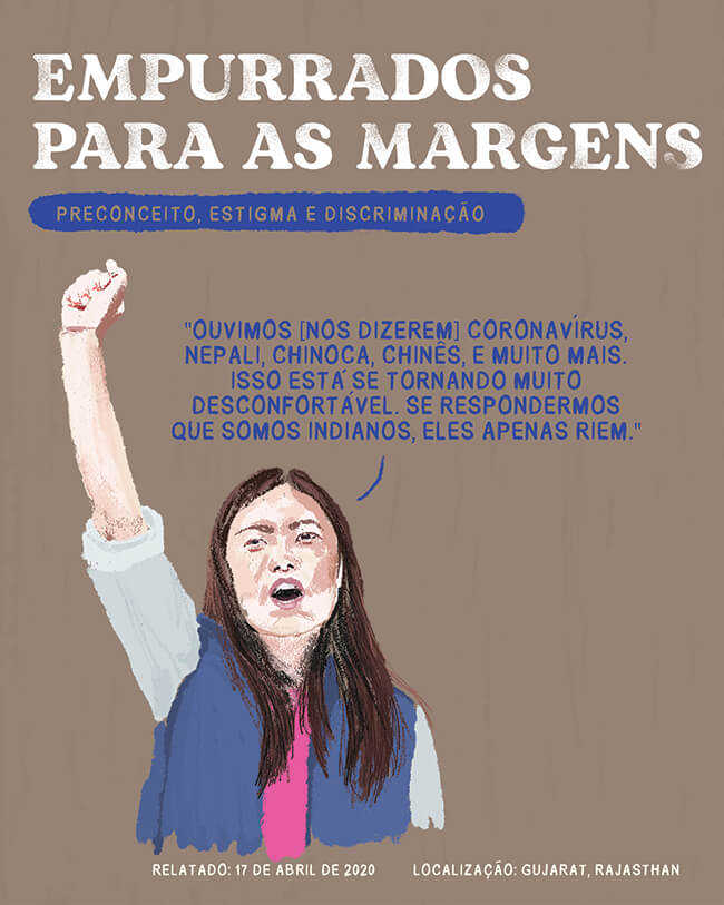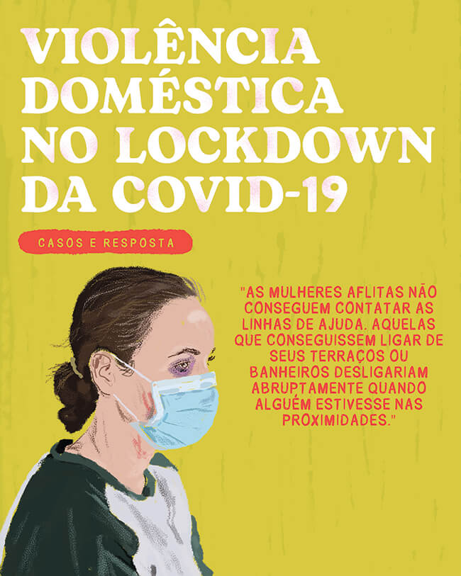 A seguir, confira cinco histórias ilustradas retiradas do projeto “Covid-19 e a Constituição”55. Para acessar os conteúdos na íntegra, acesse: COVID-19 and the Constitution, "Domestic Violence in the COVID-19 Lockdown: in conversation with Aks Foundation"; "Invisibilised Faces: Migrant Narratives"; "Pushed to the Margins"; "Experiences of Other Frontline Workers" e "Fake News and disinformation".