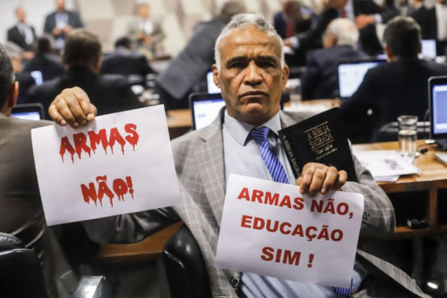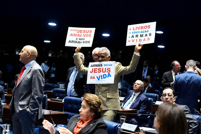 Todavia, há divergências nos posicionamentos de parlamentares da bancada evangélica. Um exemplo é o Pastor Sargento Isidoro (AVANTE/BA), deputado federal mais votado no Estado da Bahia e membro da bancada evangélica. O deputado fez uma campanha ferrenha no Congresso contra a aprovação do decreto, empunhando cartazes com dizeres como “disse Jesus: amai-vos e não armai-vos”, “armas não, educação sim” e “menos armas, mais livros”, peregrinando pelas comissões da Câmara e do Senado,4848. “Pastor Isidório Faz Intervenção na Câmara Contra Liberação de Porte de Armas,” Mídia Ninja, 9 de maio de 2019, acesso em 5 de julho de 2019, http://midianinja.org/news/pastor-isidorio-faz-intervencao-na-camara-contra-liberacao-de-porte-de-armas/. conforme a imagem a seguir.
