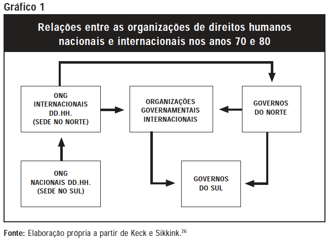 Observamos nesse gráfico o que provavelmente é uma descrição muito próxima da forma como as organizações internacionais e as organizações nacionais de direitos humanos se relacionavam durante as décadas dos 70 e 80: as organizações de direitos humanos que trabalhavam em nível nacional coletavam informações que as organizações não-governamentais internacionais utilizavam para fazer incidência nas organizações governamentais internacionais (tais como Nações Unidas ou a Organização dos Estados Americanos) e perante os governos de outros países que defendiam as causas de direitos humanos, os quais oportunamente exerciam pressão sobre o governo questionado.