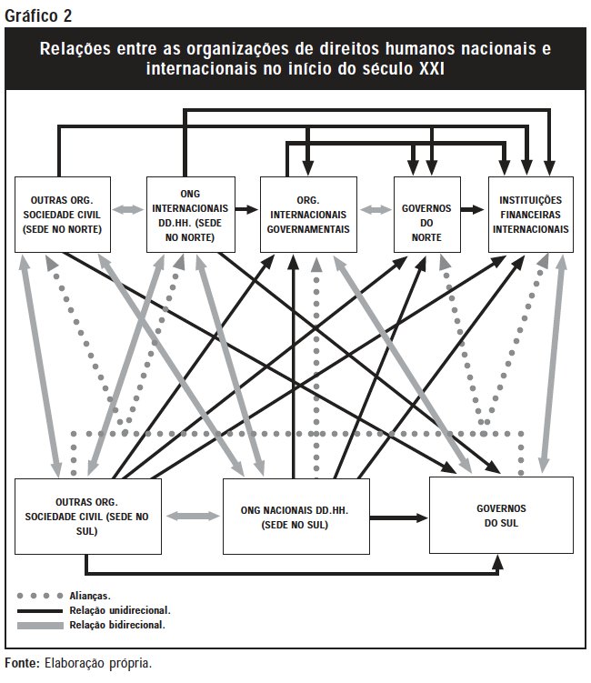 Entre estas novas alianças possíveis presentes no Gráfico 2 destacam-se especialmente (com as linhas segmentadas) certas formas de colaboração Sul-Sul, em que organizações que trabalham em nível nacional se associam com seus próprios governos para promover iniciativas que, com freqüência, sofrem a resistência de governos historicamente amigos das organizações de direitos humanos (e inclusive de algumas organizações não-governamentais internacionais). Essa é a situação que tivemos, por exemplo, nas negociações em torno da Organização Mundial de Comércio (OMC), em que organizações de direitos humanos e governos do Sul promoveram uma agenda comum em questões tais como barreiras comerciais e direitos de propriedade intelectual.