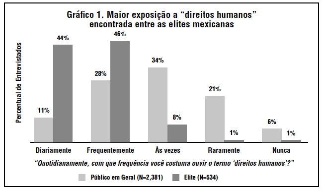 O Gráfico 1 mostra que a prevalência da terminologia de direitos humanos tanto entre a elite mexicana e o público em geral é alta, mas que a exposição da elite à essa terminologia é muito maior. Cerca de 90 por cento dos mexicanos da elite nos disseram que ouviram o termo “direitos humanos” (derechos humanos) “diariamente” ou “frequentemente”, em comparação com quase 40 por cento do público em geral. No entanto, mesmo essa faixa de 40 por cento parece extraordinariamente grande; extrapolando, ela sugere que cerca de 30 milhões de adultos mexicanos são expostos aos termos derechos humanos diariamente.