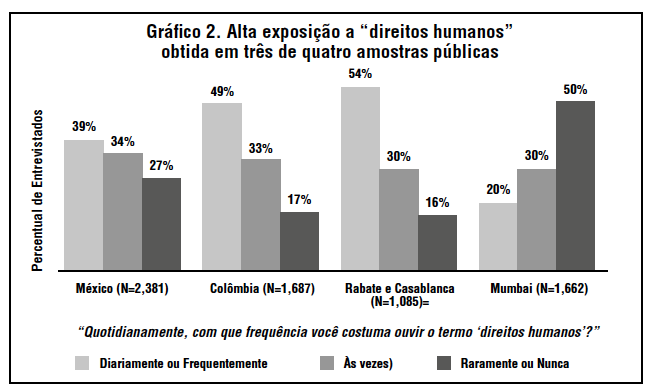 Excepcionalmente, a exposição aos direitos humanos na Colômbia e no Marrocos é ainda maior. Como o Gráfico 2 nos mostra, 49 por cento dos adultos colombianos dizem que ouvem rotineiramente o termo derechos humanos, enquanto que 54 por cento dos adultos que vivem em Rabat e Casablanca ou próximo destas cidades relataram ter ouvido regularmente o termo francês, droits de l’homme, ou o termo em árabe hukuk al insaan. E enquanto a pesquisa na Índia revela menores taxas de exposição pública – apenas 20 por cento dos adultos que vivem em Mumbai e nas redondezas da cidade relataram ter ouvido regularmente tanto o termo hindi manava adhikara ou o termo manavi adhikara em marathi – mesmo essa comparativamente baixa taxa de exposição parece alta.