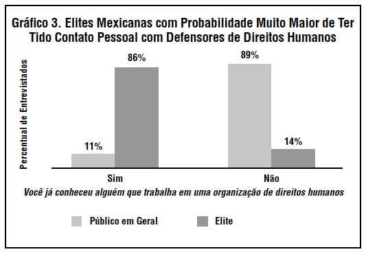 Previsivelmente, o contato pessoal com os defensores de direitos humanos foi muito menor. Ademais, no México, nossas amostras obtidas com a elite e a população em geral foram muito diferentes. Como o Gráfico 3 demonstra, 86 por cento das elites mexicanas relatam ter conhecido alguém ativo dentro de uma organização de direitos humanos, em comparação com apenas 11 por cento do público em geral. Ativistas de direitos humanos no México circulam com muito mais frequência e intensidade entre as escalas superiores da sociedade.