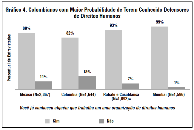 No entanto, nesta ocasião também o copo mexicano e colombiano está meio cheio, já que entre 11 e 18 por cento da população destes países em geral declarou já ter conhecido um defensor do campo de direitos humanos. No México, isso sugeriria uma quantidade total de oito milhões (veja o Gráfico 4). Essas altas taxas provavelmente são resultado de conflitos internos nos dois países relacionadas com o tráfico de drogas, deslocamentos populacionais, retórica governamental e um forte alcance dos ativistas.