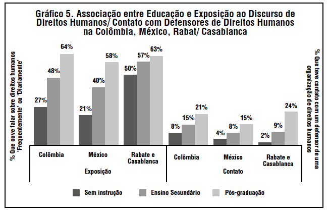 As três colunas da direita no Gráfico 5, acima da categoria “Contato”, correspondem à associação da educação com a probabilidade do entrevistado ter tido contato com um defensor da área de direitos humanos. Essa associação é mais pronunciada em Rabat/Casablanca (três colunas mais à direita), onde a variação do mínimo até o máximo na faixa de educação está associada a um aumento da probabilidade do entrevistado ter tido contato com um defensor de direitos humanos de dois a 24 por cento. A associação é mais modesta, mas ainda assim importante, na Colômbia (as três colunas mais à esquerda na seção de “Contatos”, que passam de oito por cento para aproximadamente 21 por cento) e no México (três colunas centrais em “Contato”, que aumentam de 4 por cento para aproximadamente 15 por cento).