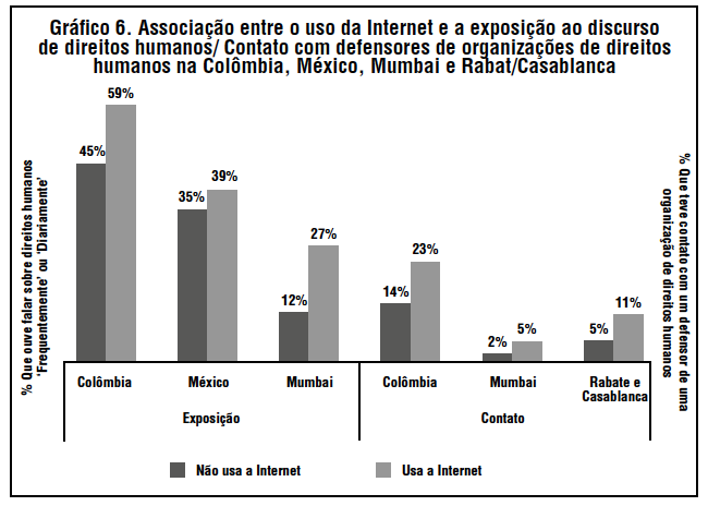 Os dados mostram uma associação positiva entre o uso de Internet e o contato dos entrevistados com defensores de direitos humanos. Na Colômbia, as chances de um entrevistado ter tido contato pessoal com um defensor de direitos humanos aumenta com o uso da Internet, de 14 a 23 por cento, enquanto que em Rabat/Casablanca e Mumbai isso mais do que dobra.