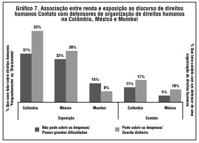 No México, essas mesmas correlações são estatisticamente significativas, embora de forma menos dramática. Os mexicanos mais pobres têm uma taxa de exposição aos direitos humanos de 32 por cento (segunda coluna cinza escuro, da esquerda para a direita), bem como uma taxa de contato pessoal de 5 por cento (barra cinza escuro mais à direita). Os mexicanos com maior renda, pelo contrário, têm maior exposição e maiores taxas pessoais de contato (39 e 10 por cento, respectivamente, como mostra a segunda coluna cinza claro da esquerda para a direita e a coluna cinza claro mais à direita).