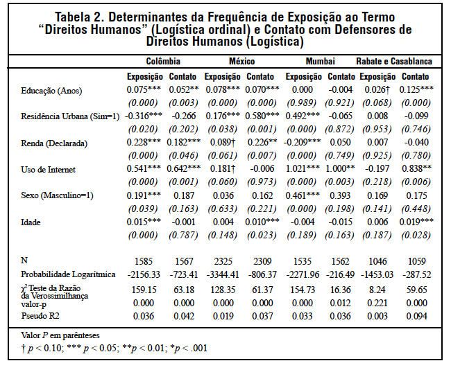 Nossas duas variáveisde controle, idade e sexo, também são estatisticamente significativas, em certas circunstâncias. Os homens são mais propensos do que as mulheres a ouvir frequentemente o termo “direitos humanos” na Colômbia e em Mumbai (ver Tabela 2), enquanto que as taxas de contato pessoal com defensores de direitos humanos aumentam com a idade no México e no Marrocos. Ademais, na Colômbia a exposição dos entrevistados aumenta com a idade.