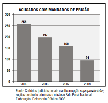 No caso dos acusados por violações de direitos humanos, a tendência dos juízes de expedir mandados de prisão tem variado significativamente ao longo dos últimos anos. Dessa forma, do total de acusados nos casos apresentados pela CVR e pela Defensoria Pública, no ano de 2005, foram emitidas ordens de prisão para 258 acusados (67%). No ano de 2006, este número foi reduzido a 197 (53%), e, atualmente, apenas 94 dos acusados possuem sua prisão decretada (27,7%). Ao restante 72,3% (245 acusados) foram expedidas intimações com restrições.