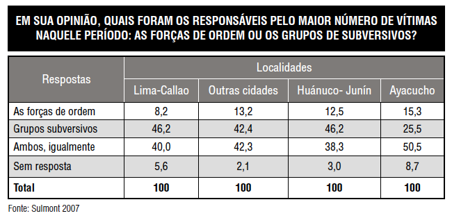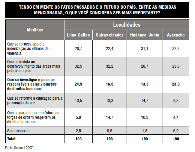 Embora nessa pesquisa sobre temas de justiça transicional, realizada por Idehpucp no final de 2006, uma grande parcela dos entrevistados tenha respondido que ambos, as forças de ordem e os grupos subversivos, foram responsáveis pelo maior número de vítimas durante o conflito (apesar de quando os dois grupos são considerados individualmente, resta claro que a maior responsabilidade é atribuída aos grupos subversivos e não às forças armadas), ao serem inquiridos sobre as medidas que deveriam ser tomadas, a maioria dos entrevistados respondeu que a concessão de indenizações monetárias e investimento em desenvolvimento nas áreas mais pobres do país tinha prioridade sobre a investigação e punição dos responsáveis pelas violações de direitos humanos.
