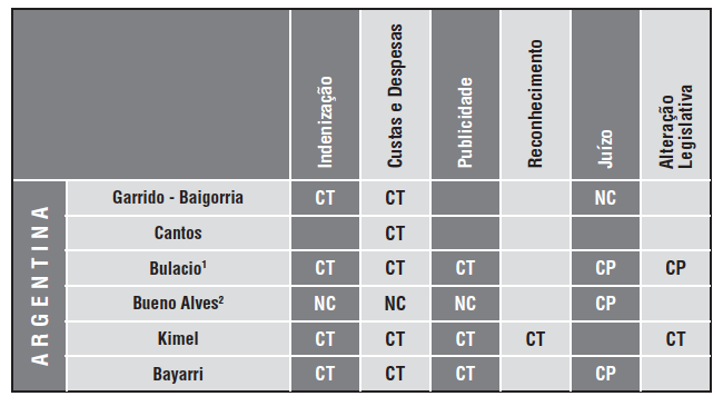 Os dados mencionados podem ser observados visualmente na seguinte tabela que elaboramos, a qual expressa se as obrigações impostas pela Corte IDH têm sido cumpridas em sua totalidade (CT), cumpridas parcialmente (CP) ou totalmente descumpridas (NC):
