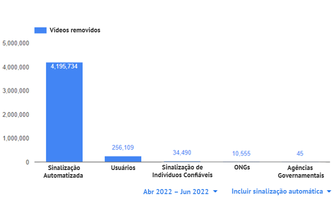 Em seu último relatório sobre cumprimento das diretrizes2626. “YouTube Community Guidelines enforcement,” YouTube, 2022, acesso em 3 de novembro de 2022, https://transparencyreport.google.com/youtube-policy/removals. (segundo trimestre de 2022), o YouTube inseriu a ilustração a seguir como forma de demonstrar a porcentagem de sinalizações humanas e automatizadas com relação ao conteúdo removível (não apenas discurso de ódio):