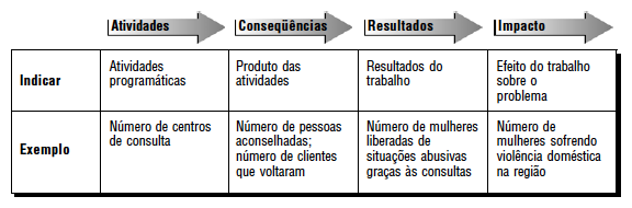 Uma vez que uma OSC tenha completado seu primeiro passo de avaliação – ter deixado clara sua missão e revisto os recursos e o apoio com os quais pode contar a serviço de sua missão – a organização pode passar para o passo dois: definir indicadores que capturem a natureza do progresso que ela espera alcançar. Esses indicadores devem ser sensíveis aos quatro níveis de atividade que levam ao impacto: atividades, conseqüências, resultados e impacto (ver tabela abaixo).
