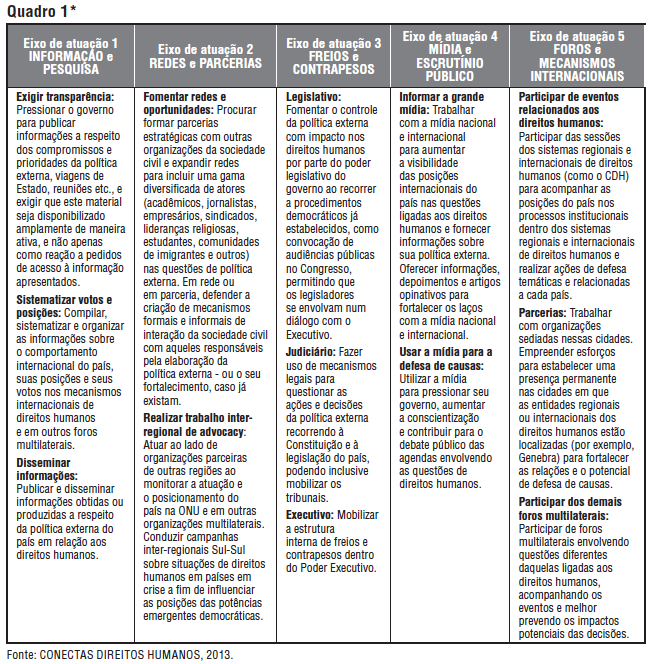 O Quadro a seguir apresenta as principais estratégias de atuação da Conectas em seu trabalho com política externa.