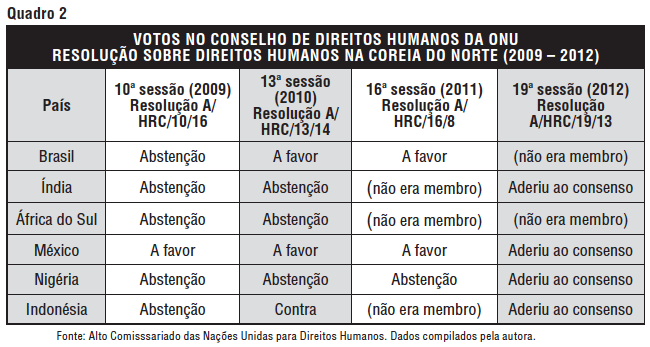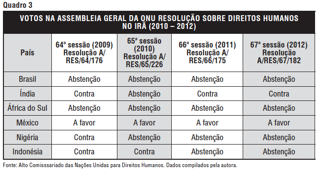 Nas votações sobre a situação de direitos humanos no Irã, no âmbito da Assembleia Geral das Nações Unidas, Índia, Brasil, África do Sul, Nigéria, Indonésia destacam-se pelo padrão de votos questionável. A análise das votações a partir de 2009 mostra que, dentre os chamados países emergentes, somente o México vota favoravelmente às resoluções. Com exceção de 2003, o Brasil se absteve desde 2001 em todas as votações de resoluções condenando violações no Irã. África do Sul também se absteve em todas as votações, conjuntamente com a Nigéria e Indonésia que, em anos anteriores, votaram contra o texto. Índia também oscila entre voto contra e abstenção, prevalecendo o primeiro posicionamento.