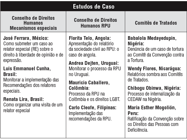 O Programa deu especial ênfase aos mecanismos do Conselho de Direitos Humanos (CDH) e aos Comitês de Tratados. Assim, Camila Asano, da Conectas, apresentou o contexto político do CDH e Philippe Dam, da organização Human Rights Watch (Genebra), discutiu a resistência dos Estados membros do CDH em adotar resoluções por país. Lúcia Nader, da Conectas, apresentou uma visão geral sobre o funcionamento da Revisão Periódica Universal (RPU) e Sandeep Prasad, Action Canada for Population and Development ACDP (Canadá), apresentou os desafios de incluir o tema dos direitos sexuais e reprodutivos no processo da RPU. Mustapha Al- Sayyid, Universidade do Cairo (Egito), falou sobre o papel dos países árabes no Conselho de Direitos Humanos. Julia Neiva, da Conectas, descreveu o funcionamento dos Comitês de Tratados e Gabriela Kletzel, Centro de Estudios Legales y Sociales – CELS (Argentina), apresentou a experiência da sua organização na apresentação de relatórios sombra.
