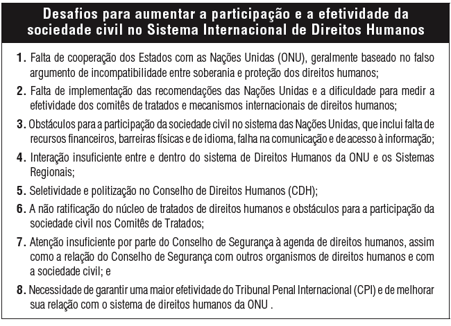O grupo de palestrantes e debatedores foi composto por acadêmicos, ativistas e oficiais das Nações Unidas, que analisaram o funcionamento dos órgãos das Nações Unidas a partir de uma perspectiva dos direitos humanos e discutiram as oportunidades que a sociedade civil tem para influenciar o debate.