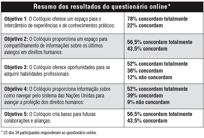 A respeito da aquisição de habilidades profissionais (objetivo 3), os participantes que “não concordaram” com a frase proposta explicaram no próprio questionário que, na verdade, “não concordaram” com a forma em que a frase foi formulada, especialmente pelo uso do termo “aquisição”. Sobre a oferta de informação de como navegar no sistema da ONU (objetivo 4), os participantes que optaram pelo “não concordo” pediram à Conectas que organizasse cursos complementares sobre o Sistema ONU. Afirmaram que um colóquio de uma semana não era suficiente para aprender sobre um sistema tão complexo como o da ONU.