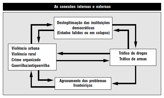 Na América Latina, a maioria dos problemas de violência capazes de desestabilizar as instituições do Estado se vincula ao comércio de drogas – que proporciona os recursos econômicos em escala relevante. O tráfico de drogas está no centro das conexões de segurança interna e externa, com potencial de desestabilizar a segurança do continente. As soluções devem se reportar tanto ao contexto social, como a uma agenda ativa de reforma da segurança pública e reforma do judiciário.