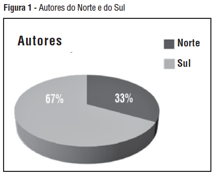 O gráfico a seguir ( Figura 1 ) mostra a proporção de autores do hemisfério Norte e Sul. Nos números 1 a 12, 67% dos autores publicados na Revista SUR eram nacionais de países do Sul, enquanto 33% eram de países do Norte. Esses dados não incluem a edição em árabe lançada em colaboração com a organização egípcia Partners in Development , a qual abrange 12 artigos de autores do mundo árabe.