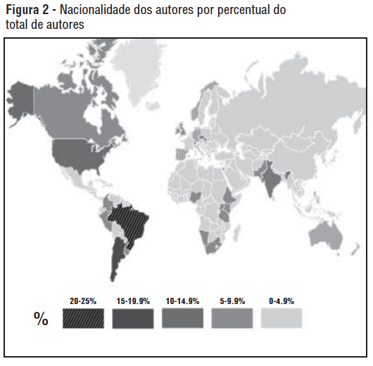 A Figura 2 mostra a distribuição dos autores publicados pela SUR por nacionalidade, mostrando a variação da nacionalidade dos autores em percentuais. O agrupamento mais elevado é aquele em que 20-25% dos autores da SUR têm nacionalidade, mostrado uma tonalidade mais escura. Os grupos seguintes são mostrados em ordem decrescente e codificados no mapa, com as nações mostradas em tons mais claros representando menor quantidade de autores publicados. Países mostrados com sombreado ainda mais leve são aqueles com autores ainda não publicados pela Revista Sur.