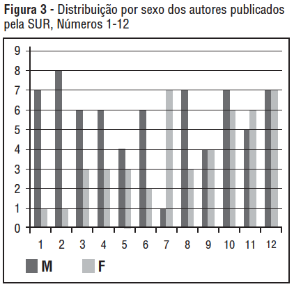 A Figura 3 mostra a distribuição de autores, por sexo, que foram publicados nos primeiros 12 números da SUR. Ao longo dos oito anos desde o lançamento da SUR, a revista passou a ter uma proporção mais equitativa em relação ao sexo dos autores publicados. Enquanto o primeiro número publicado tinha uma proporção de sete autores homens para uma autora mulher, os números 8 a 12 publicaram uma média igual de autores de sexo masculino e feminino.