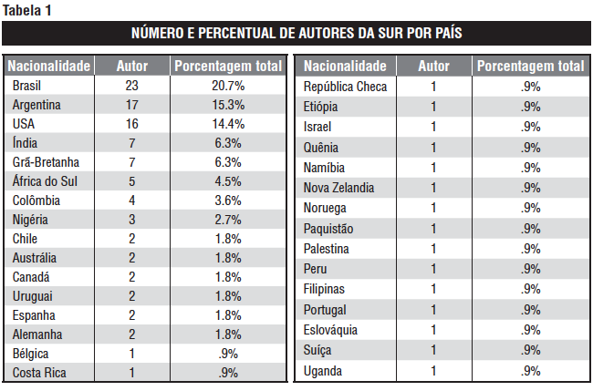 A Tabela 1 fornece uma exibição numérica das informações mostradas graficamente na Figura 2 . Os países de nacionalidade dos autores que têm contribuído para SUR são mostrados ao lado do número de contribuintes desse país e o percentual do total de autores da SUR que eles representam.